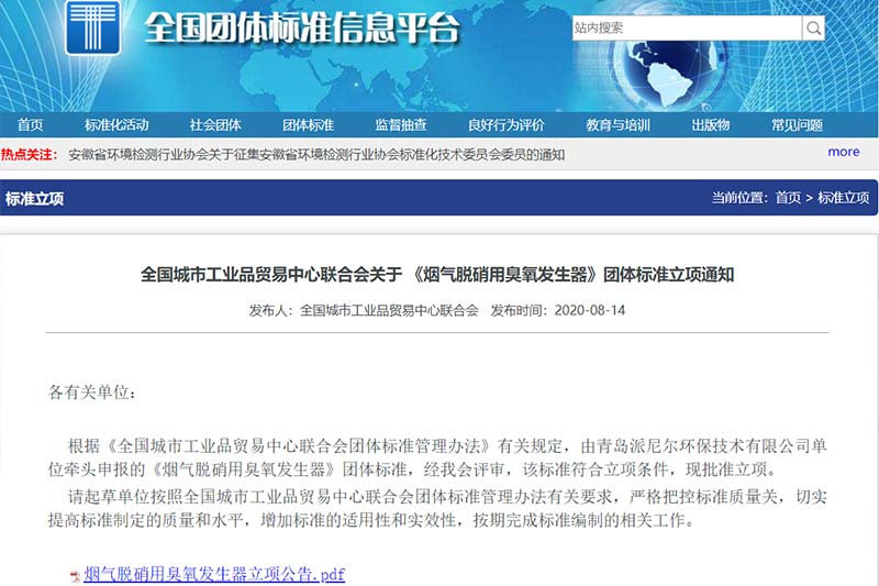 • 全國城市工業(yè)品貿易中心聯(lián)合會關于《煙氣脫硝用臭氧發(fā)生器》團體標準立項通知